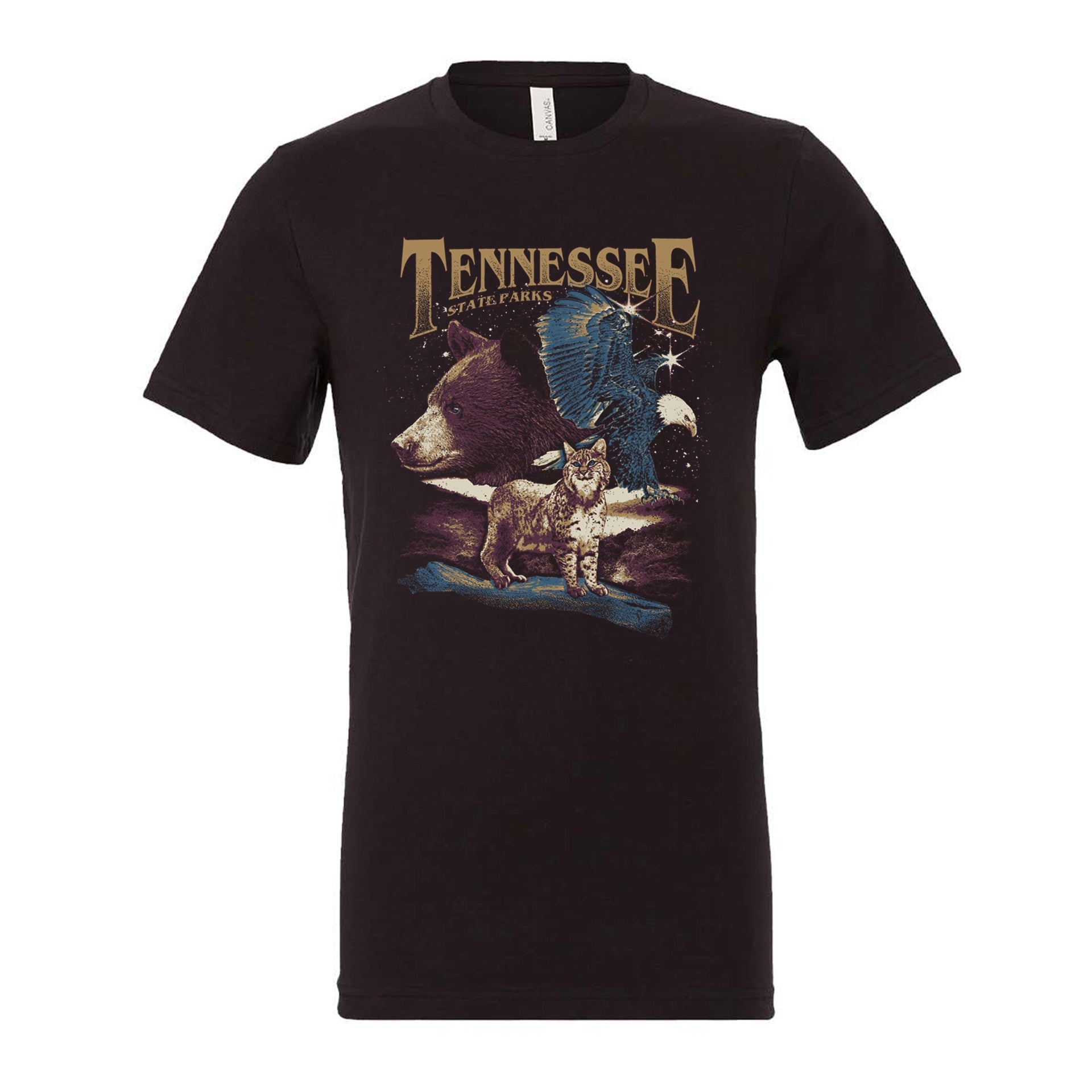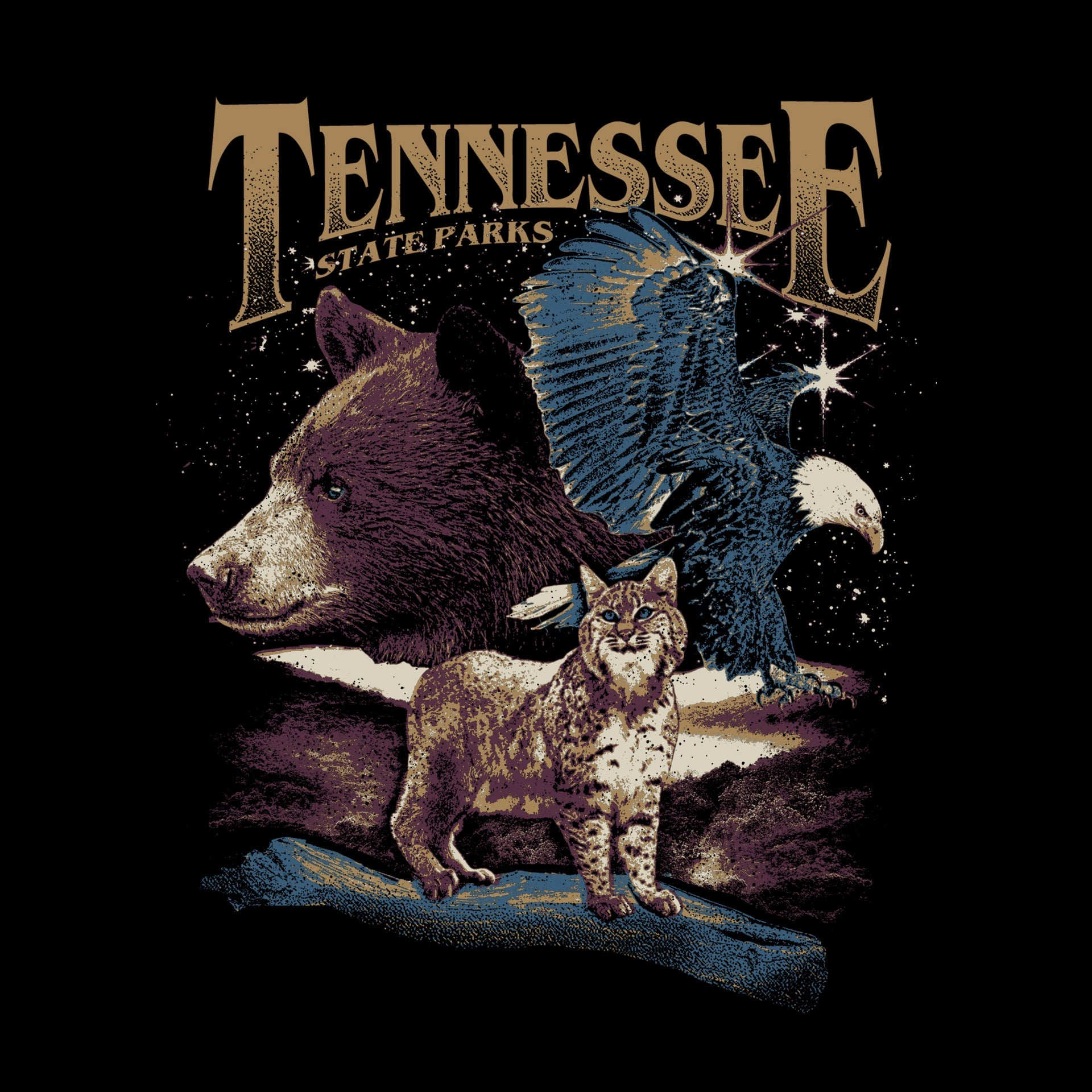 Rock on with our new Concert Tee! This band inspired black tee features several rockstars of the Tennessee wilderness: the black bear, the eagle, and the bobcat. It is printed with water-based ink on a soft 100% airlume combed and ringspun cotton shirt.