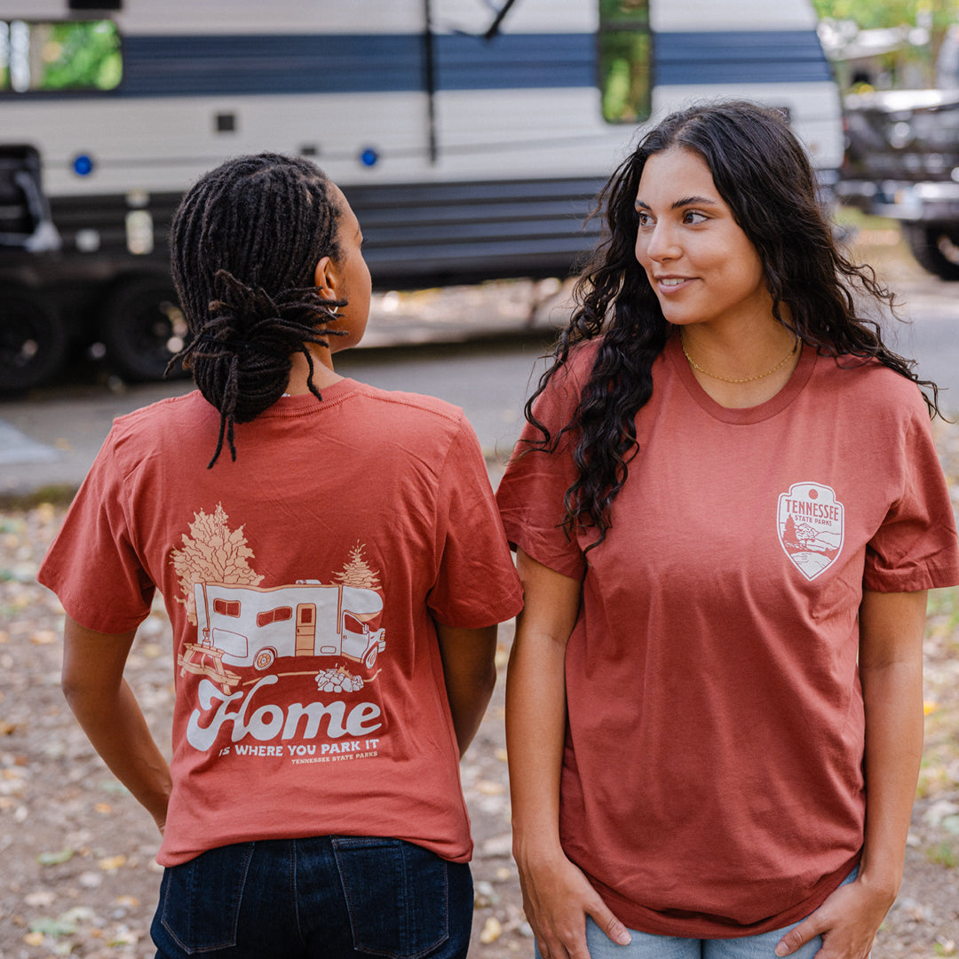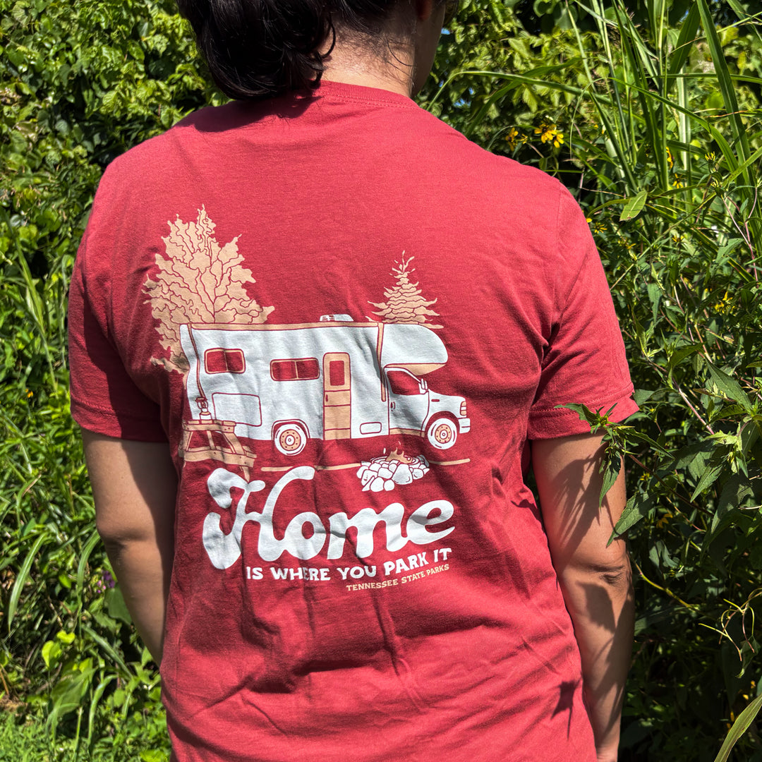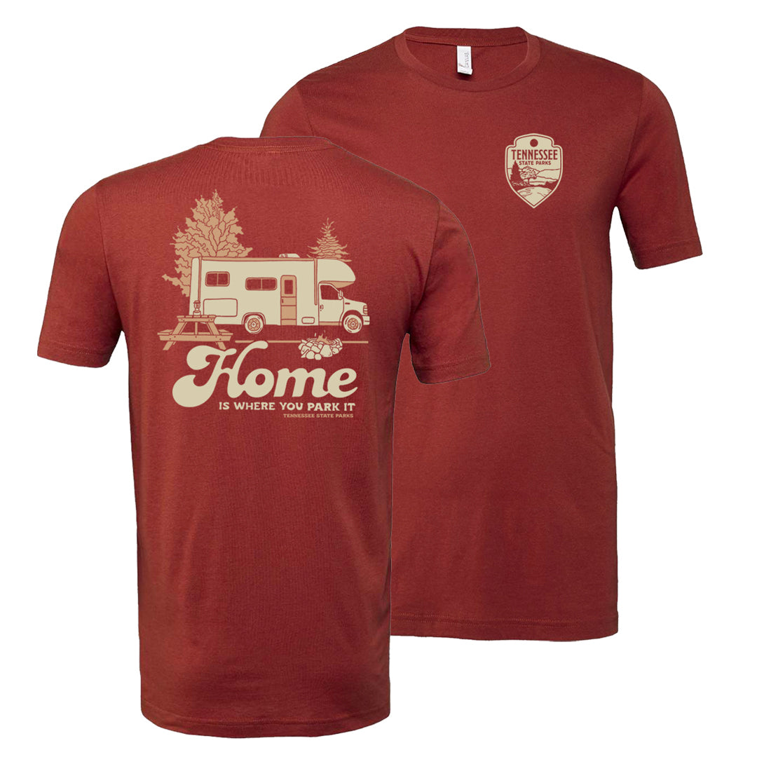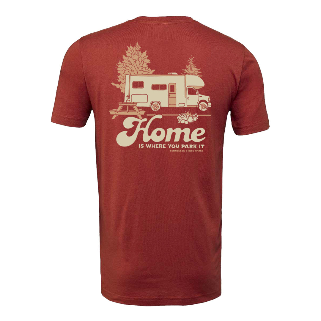 Take Home with you everywhere you go with our new Home Is Where You Park It tee! This rust colored tee features an RV, campsite, and that cozy home away from home feel.