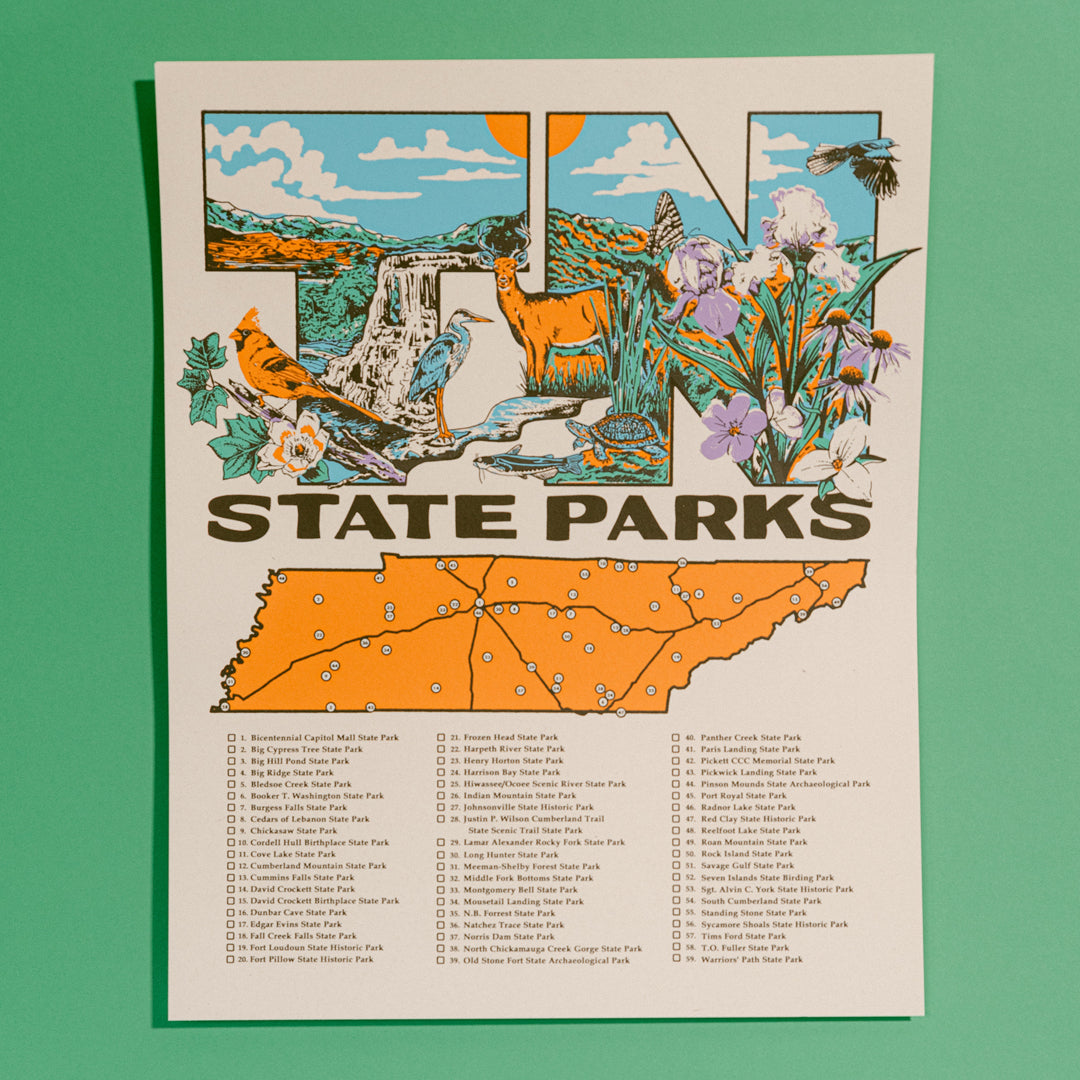 Find your way to any Tennessee State Park with our new 59 Parks Map Poster! This poster features an updated map including all 59 Tennessee State Parks and is screen printed with water-based ink onto 16"x20" #100 off-white cardstock.