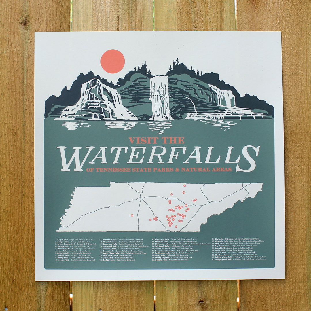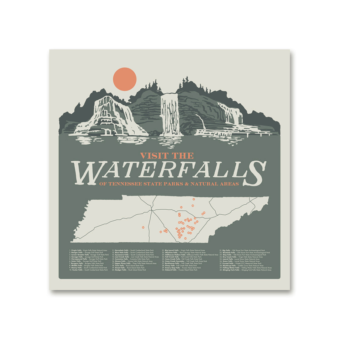 Visit all of the wonderful waterfalls Tennessee has to offer with our Waterfalls Print! This 18x18 screen printed poster features a map of the beautiful waterfalls found in Tennessee's State Parks and Natural Areas.